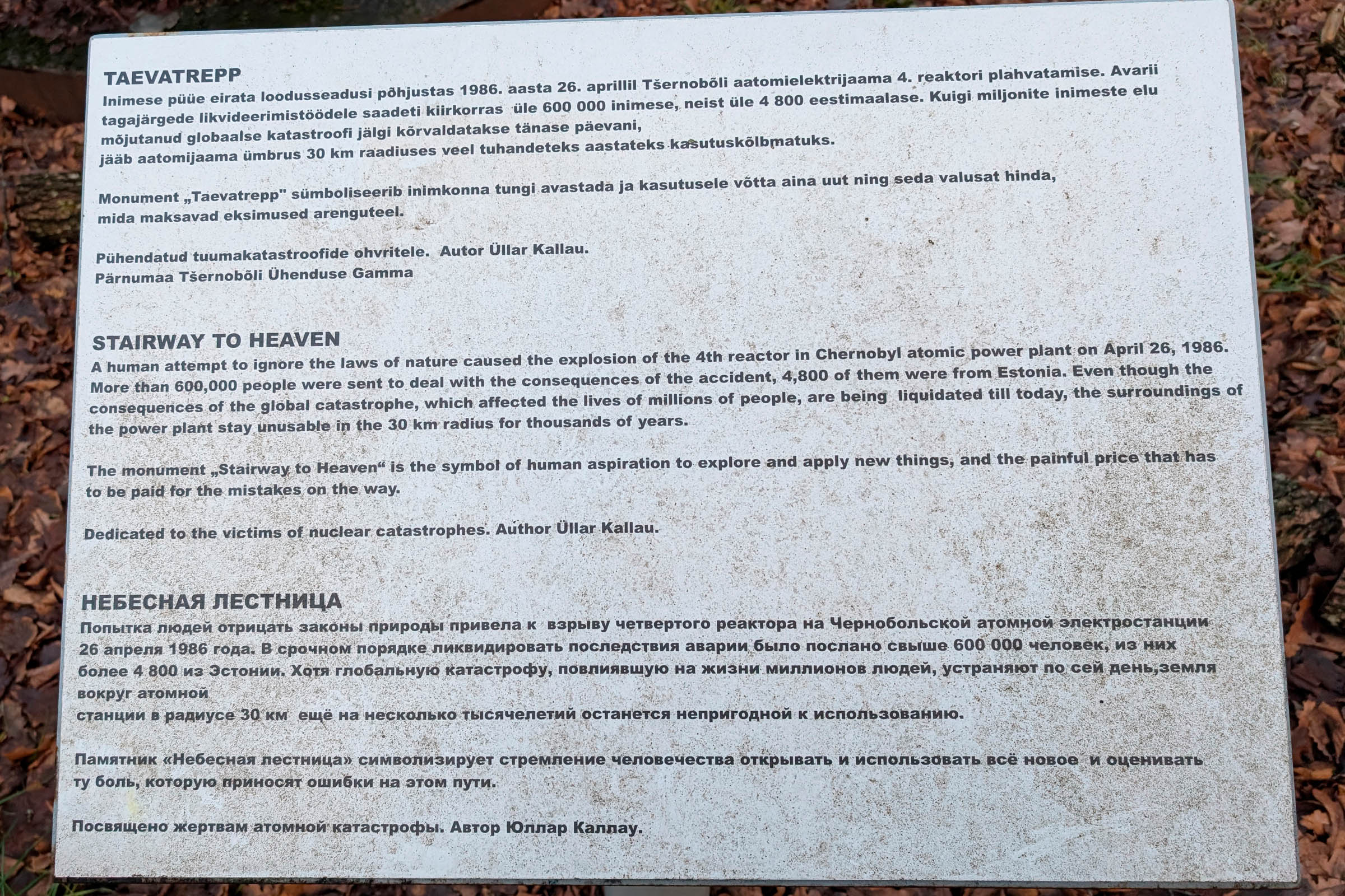 Mälestuskivi paigaldati Raeküla kooli juurde 1996. aastal. 2016. aastal, kui möödus 30 aastat Tšernobõli katastroofist, asendati mälestuskivi monumentaalsema mälestusmärgiga. Mälestusmärk kannab nime „Taevatrepp objektil“, selle puidust südamik kujutab reaktorit. Taiese autor on skulptor Üllar Kallau, metallist osa valmistas Eigo Laur. Mälestusmärk avati 15.10.2016.